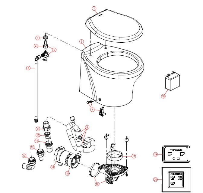 Looking for replacement parts for your Dometic/Sealand Masterflush 8620 series tall model toilets with old discharge type? Refer to the list below to find the part number you need.